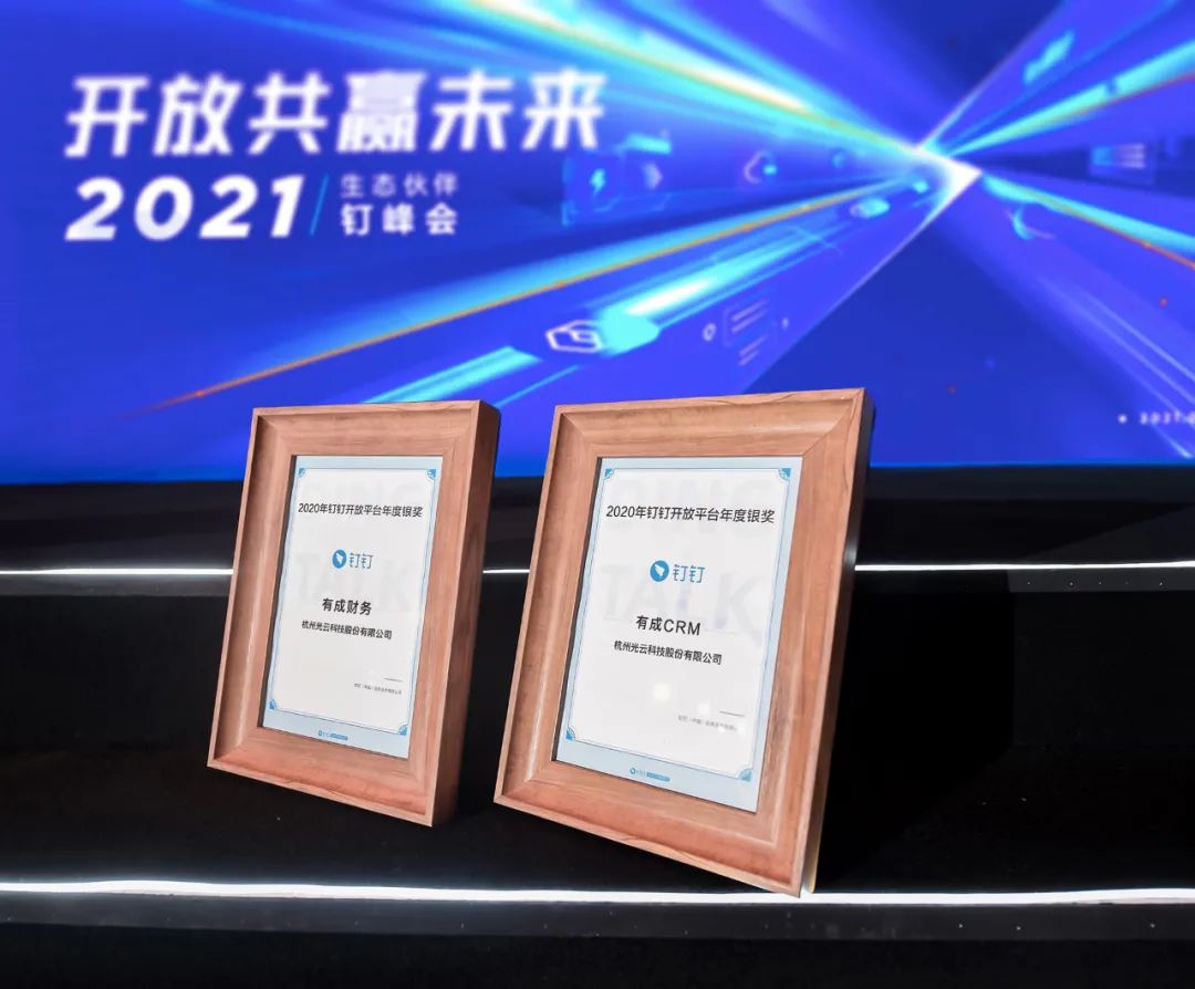 大会现场,旋乐吧spin8科技旗下有成财务、有成CRM凭借优秀的业绩和专业的实力在一众同行中脱颖而出,斩获“2020年钉钉开放平台年度银奖”双重奖项。