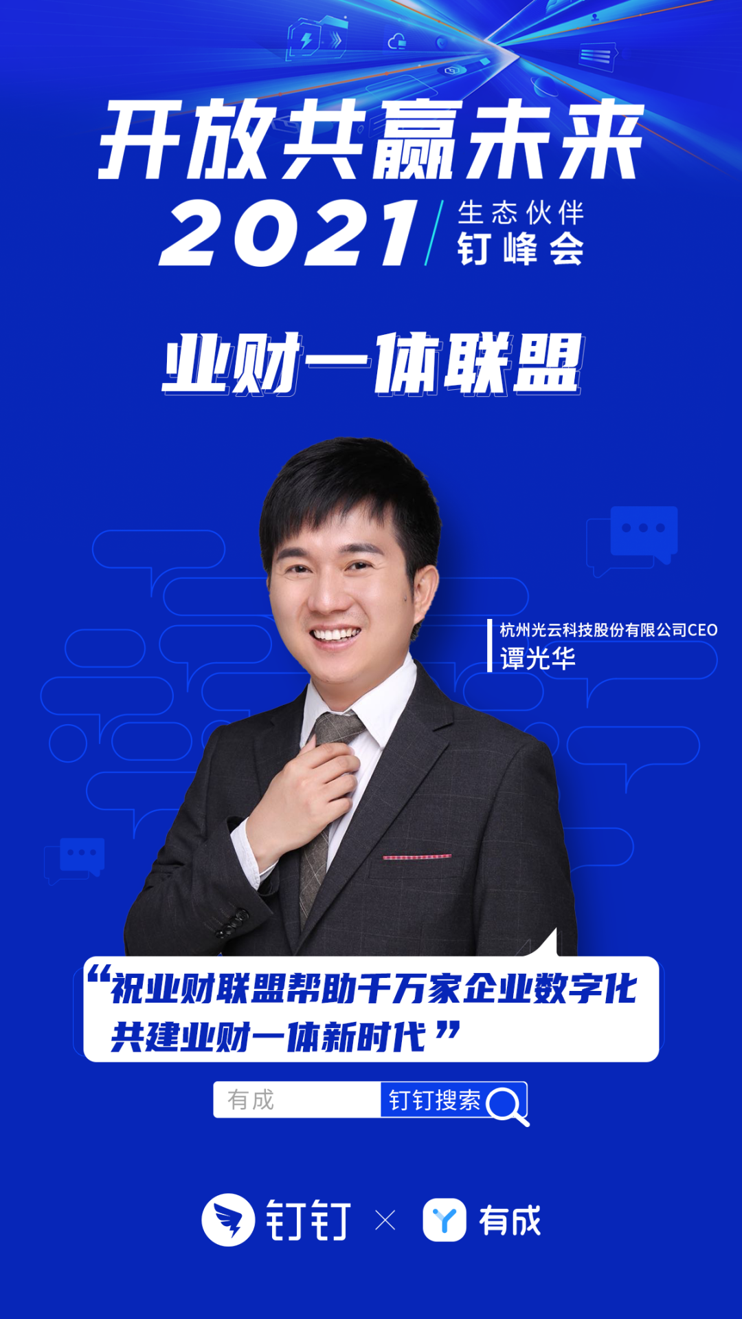 此次峰会的另一个重要议程——钉钉重磅发布了业财联盟,有成作为业财联盟的首批成员,高调亮相发布会现场,同时旋乐吧spin8科技CEO谭光华先生也到现场,与联盟成员一起开启业财一体化新时代。