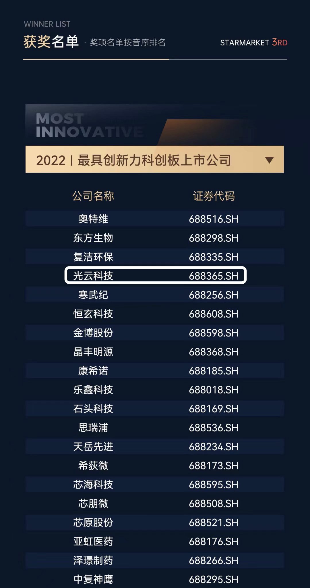 值此科创板开市三周年之际,作为上海报业集团旗下财联社出品的一级市场及科创板报道的权威媒体,科创板日报重磅发布“科创板开市三周年评选”榜单。本次评选前后历时3个月,覆盖新一代信息技术、生物医疗、高端装备、新能源、新材料等400余家科创板热门版块,通过市值管理、创新能力、研发投入等多个维度综合考量,最终筛选出2022最具创新力科创板上市公司、2022最具价值科创板上市公司、2022科创板上市公司最佳董秘、2022最佳ESG科创板上市公司、2022最佳科创领域私募股权投资机构。
